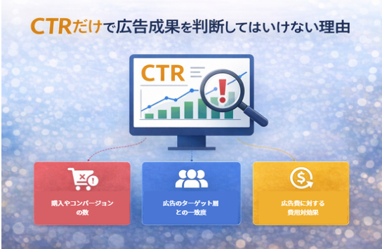 CTRだけで判断してしまうと、成果の本質を見誤るリスクがあります。たとえば、CTRが高いからといって広告をそのまま継続すると、実はLPの内容が弱くCVRが低いまま放置されてしまうことがあります。また、CTRが低い広告を停止してしまうと、実はターゲティング精度が高くCVRが良い広告を捨ててしまうことにもなりかねません。